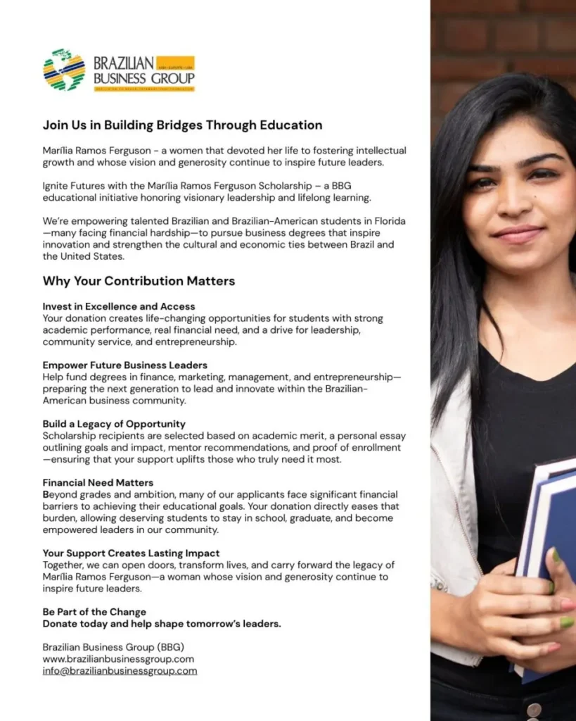 The Marília Ramos Ferguson Scholarship was created by the Brazilian Business Group (BBG) to honor the legacy of Marília Ramos Ferguson, a beloved member of the Brazilian-American community who dedicated her life to education, cultural exchange, and empowering future leaders.